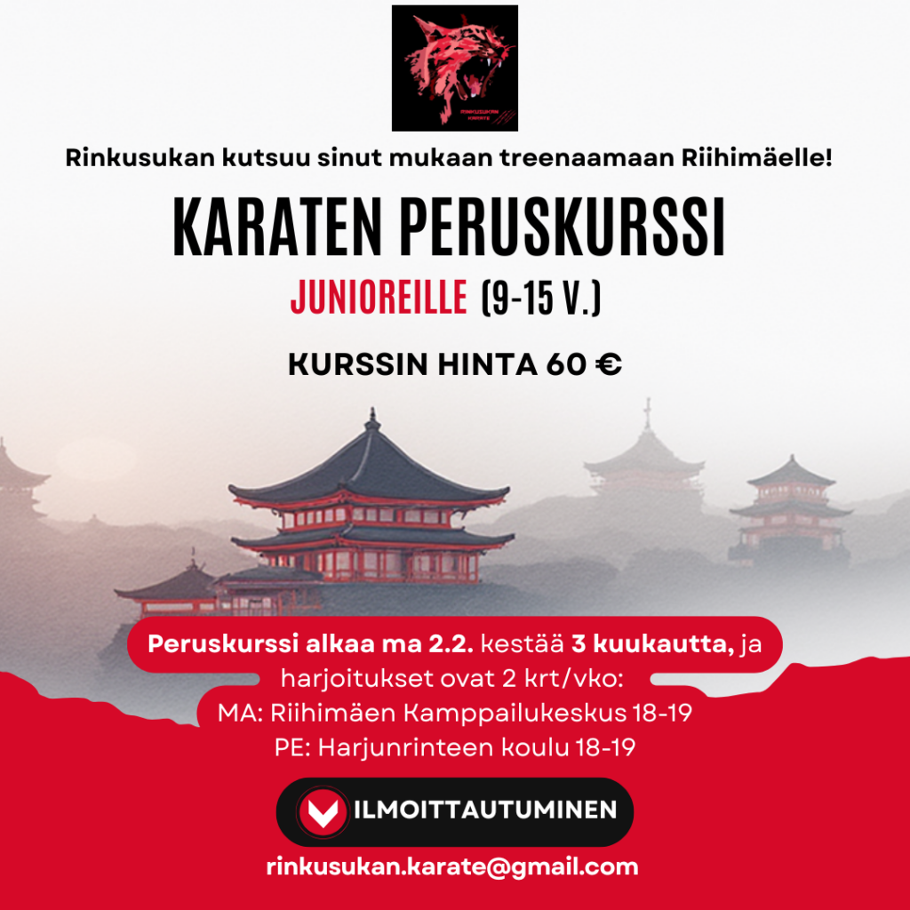 Rinkusukan Karate kutsuu sinut mukaan treenaamaan Riihimäelle! Karaten peruskurssi junioreille (9–15 v.) Peruskurssi alkaa ma 2.2. Kesto 3 kuukautta • Harjoitukset 2 krt / vko Ma & pe klo 18–19 Kurssin hinta 60 € Peruskurssilla opit karaten perusteet turvallisesti, hyvässä porukassa ja ohjatusti. Tervetuloa mukaan Rinkusukan Karaten junioreiden (9–15 v.) peruskurssille! Kurssi sopii aloittelijoille – […]